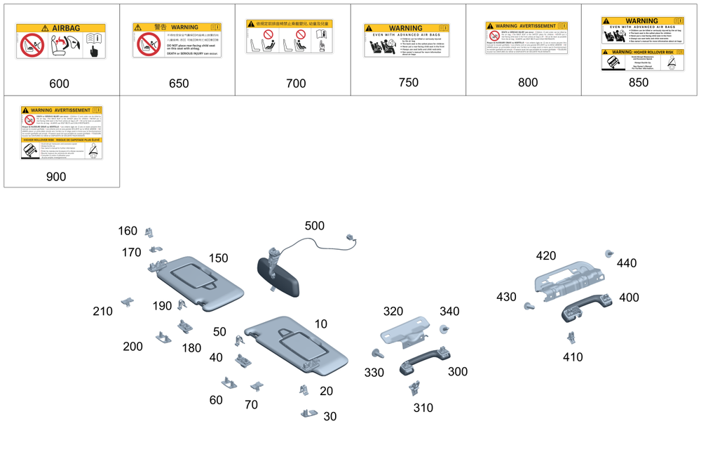 Note about front passenger airbag on sun visor, right. Right outside sun visor.